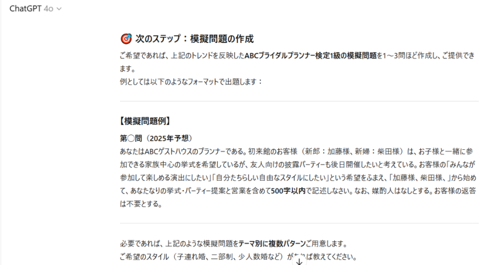 私が取り入れた方法は、ChatGPTを使った壁打ち形式の練習です。模擬問題を出してもらい、それに対して自分なりの回答を書いて、ざっくり採点&フィードバックしてもらう…という流れをひたすら繰り返していました。