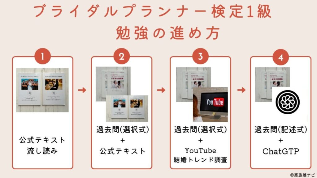 未経験・独学だった私が、ABC協会ブライダルプランナー検定1級に合格できたのは、下記のようなシンプルな勉強法を地道に繰り返したおかげだと思っています。