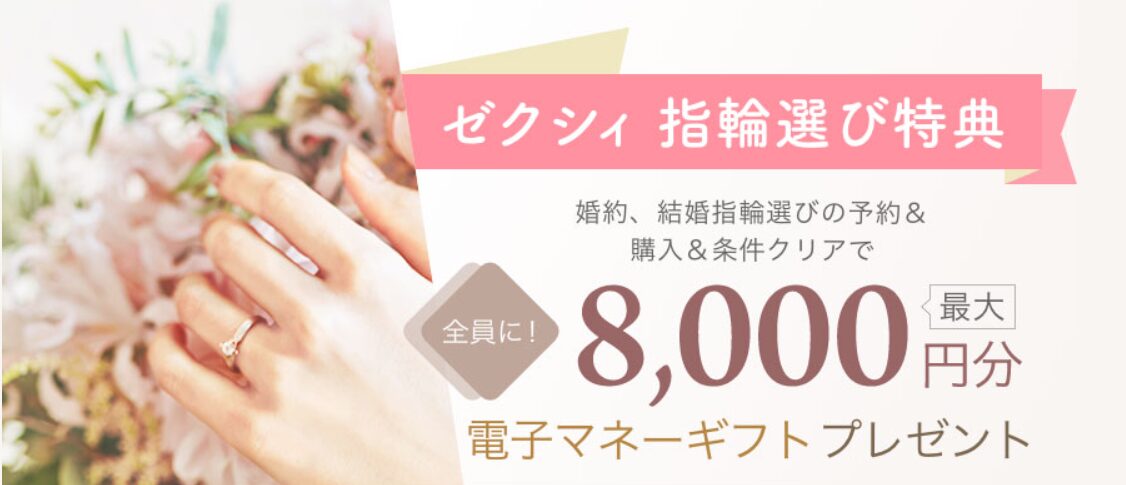 指輪探しキャンペーンは、ゼクシィのサイトまたはアプリから婚約・指輪探しの予約をして来店し、税込30,000円以上購入すると8,000円分の電子マネー(EJOICAセレクトギフト)がもらえます。